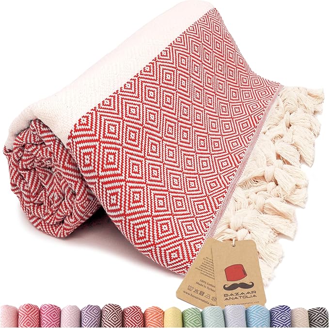 Bazaar Anatolia Turkish Beach Towel – 100% Cotton, Quick Dry, Sand Free Towel for Bathroom, Camping, Travel – Oversized 71x39 Inches – Diamond Red