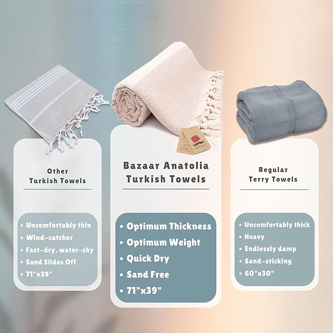 - Versatile: There are many ways to use Turkish Beach Towel. You can use the turkish towel as a scarf on the outside, shawl on the terminal, travel blanket on an airplane, oversized beach towel when you get off the plane and go to the beach. Quite useful as a travel beach towel. Or you can use as a bathroom towels, yoga mat towel, pool towel or a throw blanket in your house.