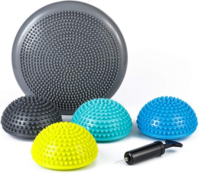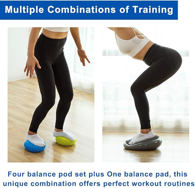 - IMPROVE STRENGTH AND CONDITIONING: Our Balance Pod Kit includes 4 colorful balance pods and 1 wobble cushion, perfect for enhancing core strength, balance, and stability. Great for physical therapy, rehabilitation, and improving agility for all ages. The inflatable design allows you to adjust the firmness, tailoring it to your personal comfort and training needs.