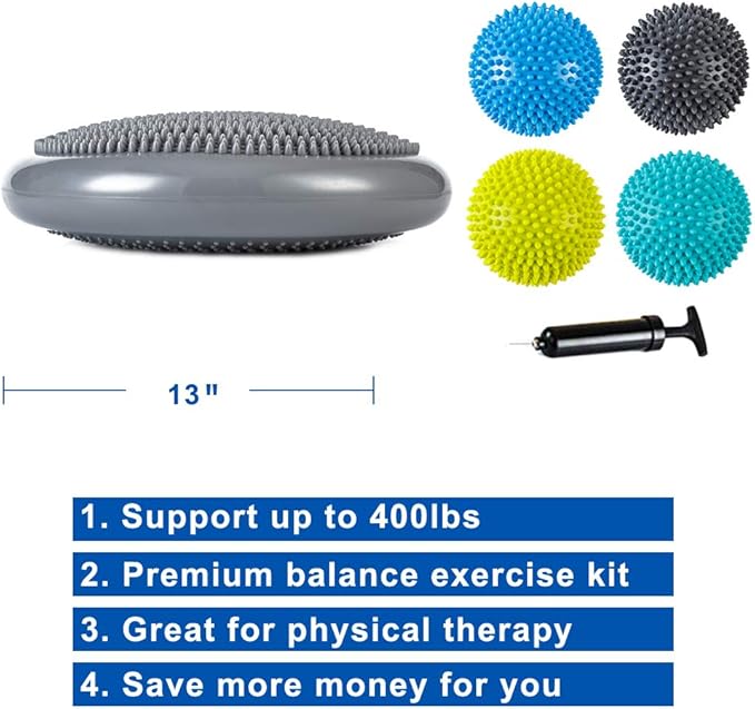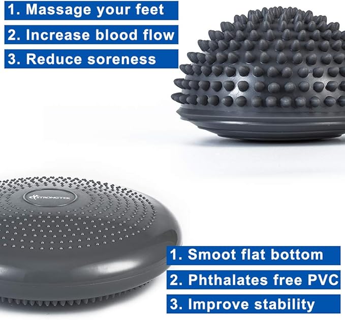 - FOOT MASSAGE AND IMPROVED CIRCULATION: The spiked surface of the balance pods gently massages your feet, helping to improve blood circulation and reduce foot soreness. Ideal for those who spend long hours on their feet, the inflatable surface provides a comfortable and effective solution for foot therapy and relaxation.
