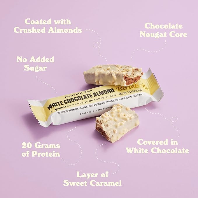 - BAREBELLS WHITE CHOCOLATE ALMOND PROTEIN BAR - 12 individual yummy Barebells protein bars! Barebells White Chocolate Almond is as delicious as it sounds, it is the perfect choice for everyone on the lookout for that extra protein fuel or simply when your taste buds want something really tasty. The protein bar is completely free from added sugars and is enriched with 20 grams of protein. White chocolate and almond are a really a face-hole delight!