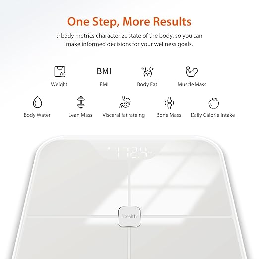 - Full Body Composition - iHealth Nexus scale for body weight displays 9 body compositions to better understand yourself. Monitors weight (kg, lb, st), body fat, body water, muscle mass, lean mass, and bone mass. Calculates BMI, daily caloric intake, and visceral fat.