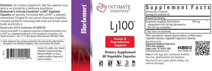 Bluebonnet Nutrition Intimate Essentials LJ100, Soy-Free, Gluten-Free, Non-GMO, Dairy-Free, Kosher Certified, Vegan, 60 Capsules, 30 Servings