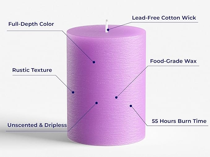 Set of 3 Pillar Candles 3" x 4" Unscented Handpoured Weddings, Home Decoration, Restaurants, Spa, Church Smokeless Cotton Wick - Lilac