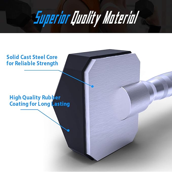 - Hexagonal Design for Convenience: The hex-shaped heads prevent unwanted rolling and allow for easy storage. The knurled ergonomic handle ensures a secure grip, reducing the risk of slipping. Additionally, the flattened hex weights reduce noise, enhancing your overall workout experience.