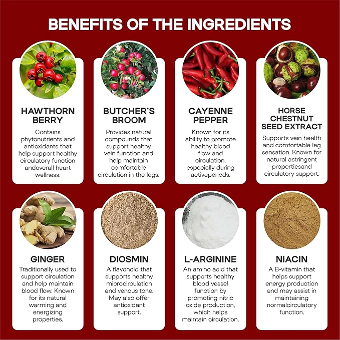 - Vascular and Vein Wellness – Formulated with Niacin, Hawthorn, L-Arginine, Horse Chestnut, Diosmin, and Ginger Root, this blend is crafted to support vein health and leg wellness as part of your daily routine.