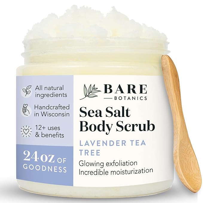 Bare Botanics Lavender Tea Tree Body Scrub 24oz | Made in Madison, WI | All Natural Sea Salt Exfoliator w/ Skin Loving Moisturizers | Vegan & Cruelty Free | Gift Ready Packaging w/ a Cute Wooden Spoon