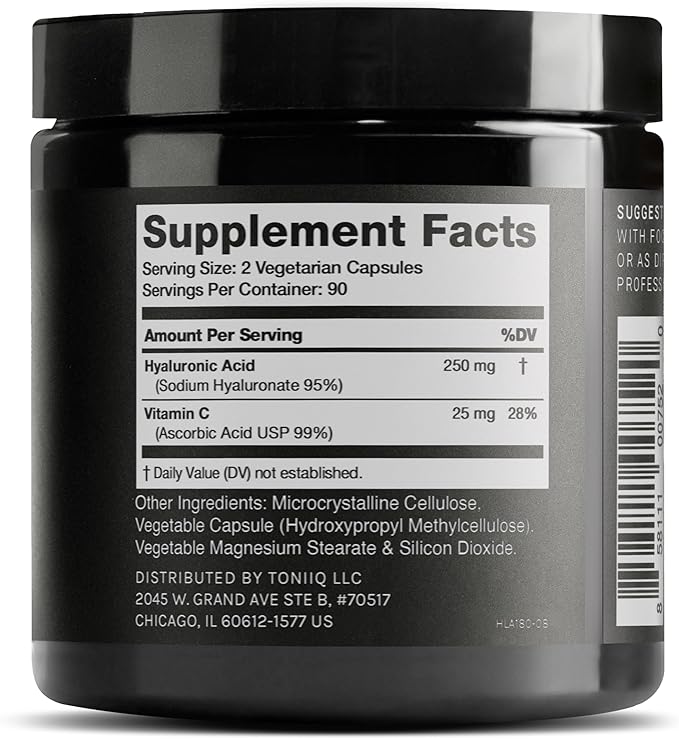 - The Highly Purified Form of Hyaluronic Acid - Toniiq Hyaluronic Acid capsules contain 250mg of the highest quality hyaluronic acid powder in each serving – ethically sourced, grown and produced using a fermented production process to ensure 95% standardized purity (other hyaluronic acid supplement products won't disclose their level of purity).