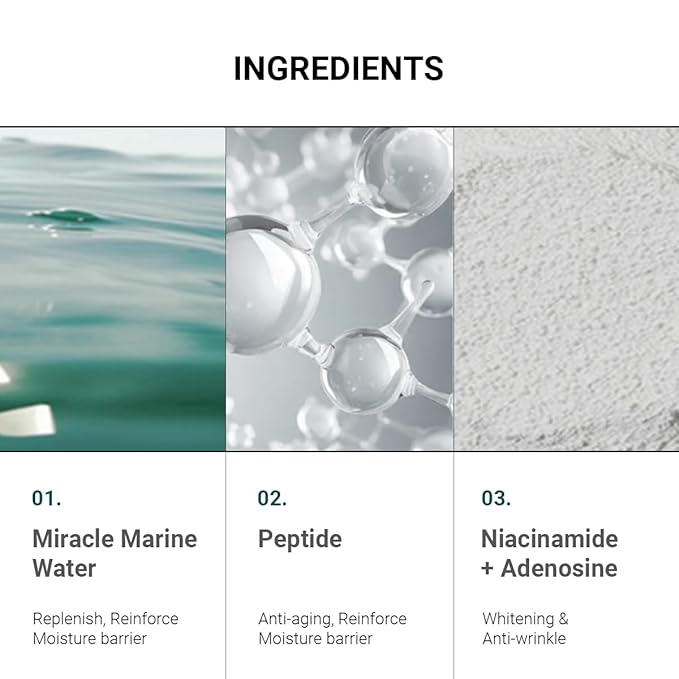 - SUPERCHARGED MARINE TREASURE: Miracle Marine Water (51% algae extract), Peptides & Niacinamide work together to deeply nourish, hydrate, and smooth the skin, tackling dryness and wrinkles at their source.