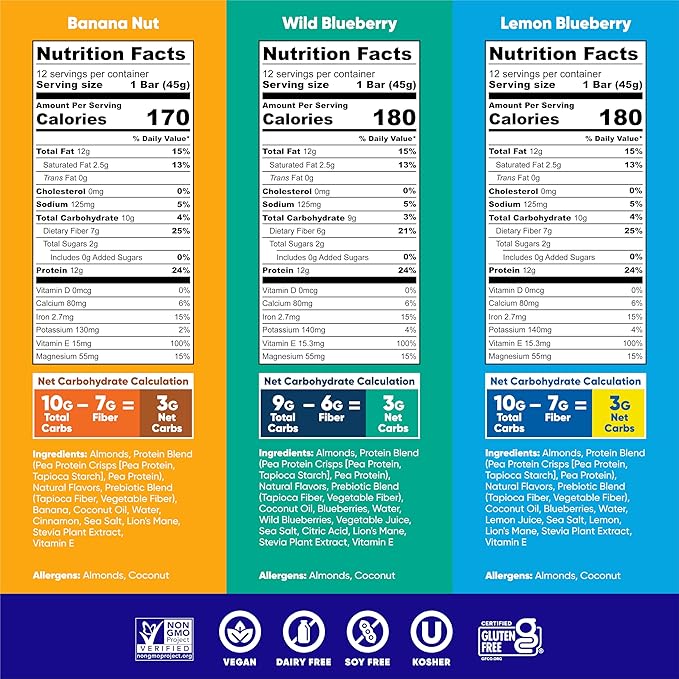 - ONLY 2–3G NET CARBS WITH 10 DELICIOUS FLAVORS: Each bar has 9–12g total carbs, 6–9g fiber, 10–13g healthy fats, and just 160–180 calories. Enjoy any of our delicious flavors which includes Chocolate Sea Salt, Peanut Butter Chip, Banana Nut, Chocolate Mint Chip, Almond Butter Chip, Lemon Blueberry, Matcha Chai, Wild Blueberry, Toasted Coconut Chip, and Salted Caramel Chip
