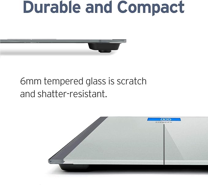 - A Durable Choice: 6-mm tempered glass platform provides exceptional durability and comfort. Equipped with a supportive frame and anti-skid paddings to prevent slipping, you can rely on the sturdiness of our scale