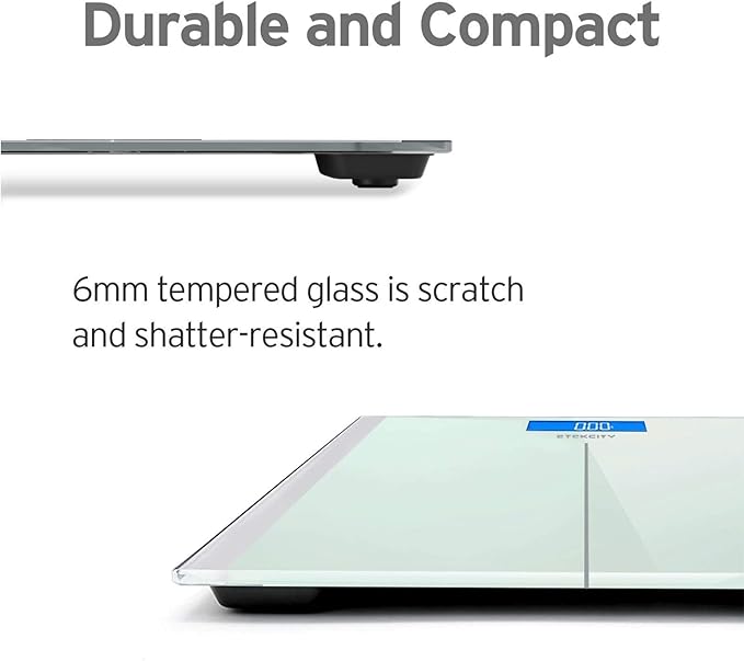 - A Durable Choice: 6-mm tempered glass platform provides exceptional durability and comfort. Equipped with a supportive frame and anti-skid paddings to prevent slipping, you can rely on the sturdiness of our scale