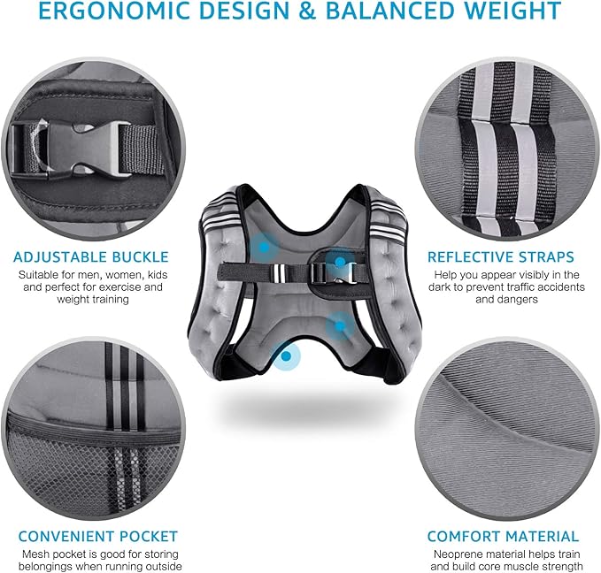 - ERGONOMIC DESIGN & BALANCED WEIGHT - This weight vest is distributed weight throughout your body, including an adjustable strap to prevent slipping and sliding during exercise (WEIGHT NOT ADJUSTABLE)