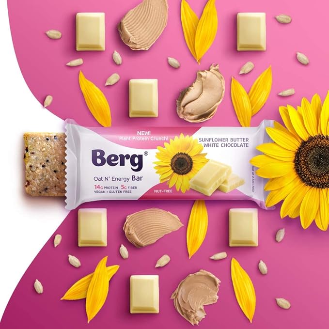 Berg Oat N' Energy Bar | Sunflower Butter White Chocolate | Plant Based Protein Bar | Non-GMO, Gluten Free, Nut Free and Vegan | Low Sugar, Healthy Snack Bar | High Fiber | On The Go | 2.5oz (8 Packs)