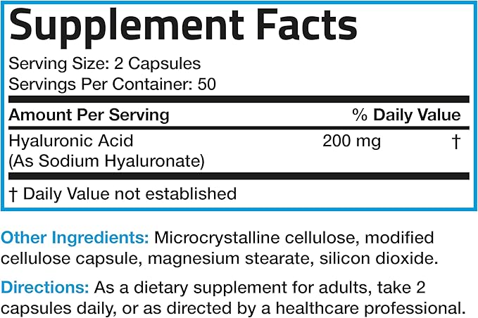 - High Potency Formula: Bronson Hyaluronic Acid provides 200 MG of high-quality Hyaluronic Acid per serving (2 vegetarian capsules). Hyaluronic Acid is a naturally occurring substance that is found throughout the human body and is necessary for joint health, skin health and connective tissue.*