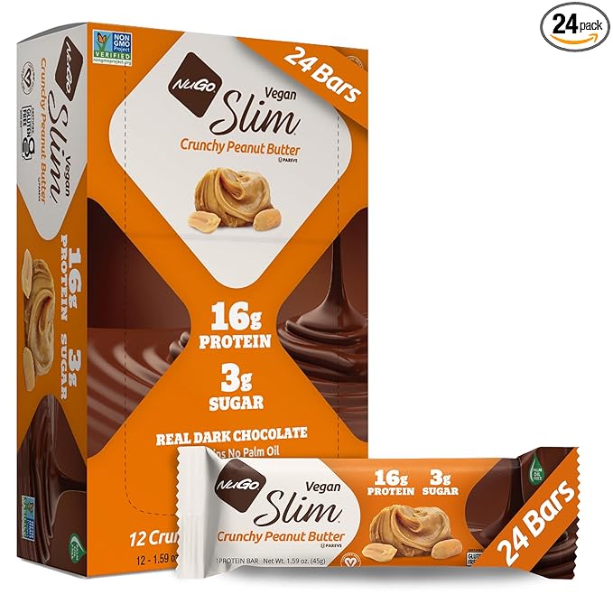 Nugo Slim Dark Chocolate Crunchy Peanut Butter, 16g Vegan Protein, 3g Sugar, 7g Fiber, Low Net Carb, Keto Friendly, Gluten Free, 24 Count