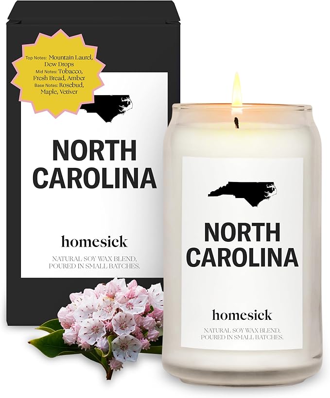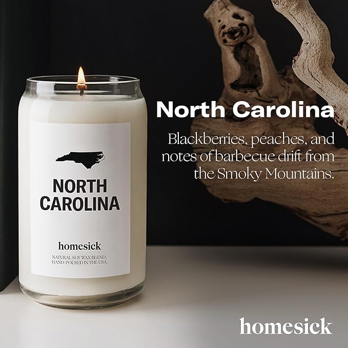 - Smoky Mountain Charm: Blackberries, peaches, and notes of barbecue drift from the Smoky Mountains. Cinnamon and clove mix with vanilla and amber. The North Carolina candle from Homesick brings the warmth and charm of the Tar Heel State to your home. 13.75 oz.
