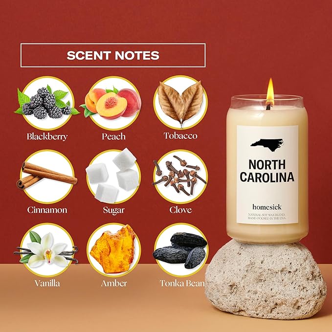 - Scents As Unique As Your Memories: Experience the heart of North Carolina with the sweet allure of blackberries and peaches, the warmth of cinnamon and clove, and the comforting embrace of vanilla, amber, and tonka bean.