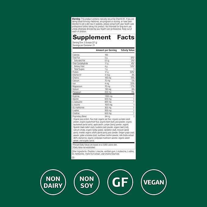 - Protein Powder Supplement: An excellent source of protein as it contains 17 g per serving from pea isolates, pumpkin concentrate, oat flour, and buckwheat flour; provides amino acids required for conjugation enzymes (phase II enzymes)*