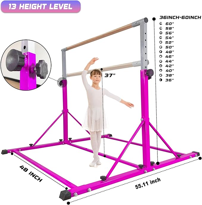 - Idea Size For Kids Home And Club Use: This gymnastic training bar Length is 55.11inch, width is 4 ft, height is adjustable from 36inch to 60inch, 13 level choices. The size is neither large nor small, ideal for home and gymnastic centre use