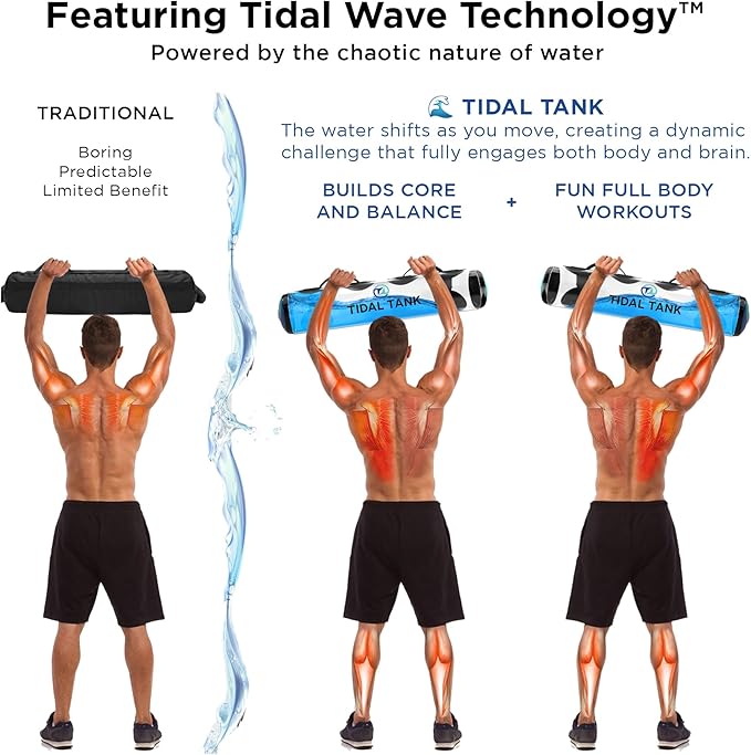 - GET THE ULTIMATE FULL BODY WORKOUT THROUGH INSTABILITY ๐ Pick up the Tidal Tank and you immediately feel its unforgiving properties. The entire weight of the water sloshing from one side to the other in response to the smallest tilt. In order to raise it above your head, even the smallest muscles are activated, working together with the bigger muscles to maintain balance and power. Because of this, even 20 pounds of water can humble trained athletes.