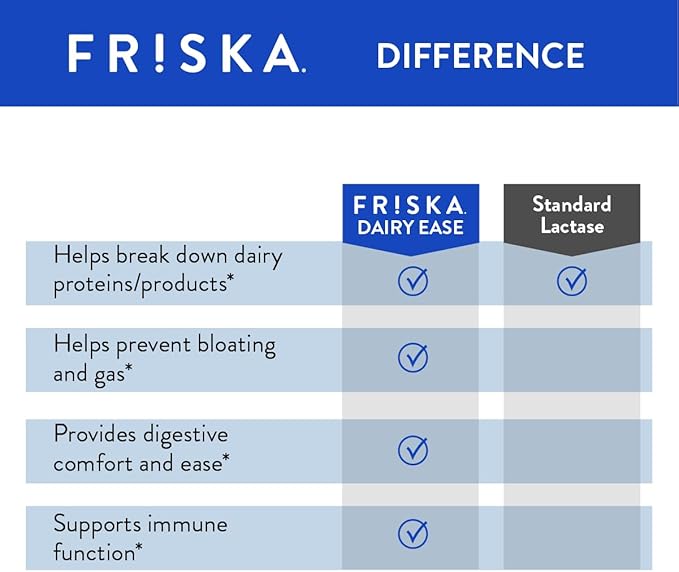 - DIGESTIVE ENZYME SUPPORT: FRISKA's multi-functioning Dairylytic digestive enzymes and potent probiotics help break down hard-to-digest proteins and lactose sugars found in dairy products. Provides natural lactase and protease support.