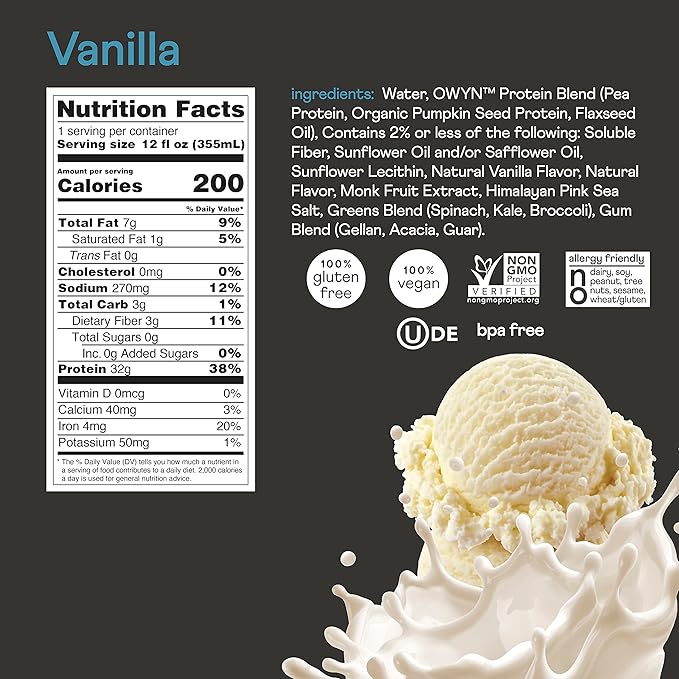 OWYN Only What You Need Pro Elite Vegan Plant Based High Protein Shake, Vanilla, 12 Pack, 32g Protein, Amino Acids, Prebiotics, Omega-3, Workout and Recovery, 0g Net Carbs, Zero Sugar, Keto