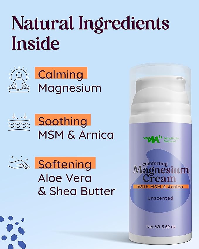 - Mindfully Natural Magnesium Cream‘s unique formula has calming magnesium, MSM known for helping the body balance it's swelling response, organic frankincense oil and arnica to help kids relax, soothe and prepare for bedtime.