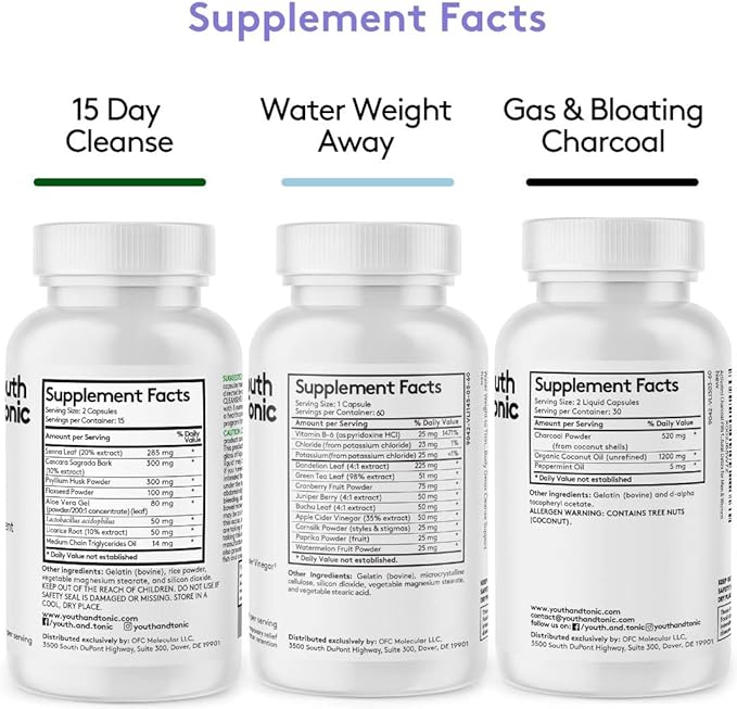 Youth & Tonic 3X Belly Bloating Pills for Puffiness, Water Debloat, Stomach, Gut & Colon Cleanse Detox | with Liquid Activated Charcoal, Coconut & Peppermint Oil, Senna Leaf & More | 150 Capsules