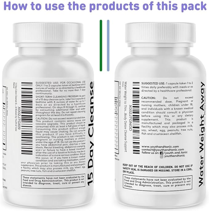 - [ HOW TO USE IT]: Carefully read the cautions on the products labels | Take 2 capsules of Gas & Bloating up to 3 times daily with a meal and don’t use it more than 3 consecutive days | Take 1-2 tablets of 15 day cleanse at bedtime with a meal and be advised that increasing the dosage from 1 to 2 capsules too soon may lead to discomfort for some individuals | Take 1 pill of Water Away preferably with a meal