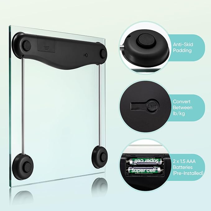 - A Durable Choice: The scale’s 6-mm tempered glass platform provides exceptional durability and comfort. Equipped with a supportive frame and anti-skid paddings to prevent slipping, you can rely on the sturdiness of our scale