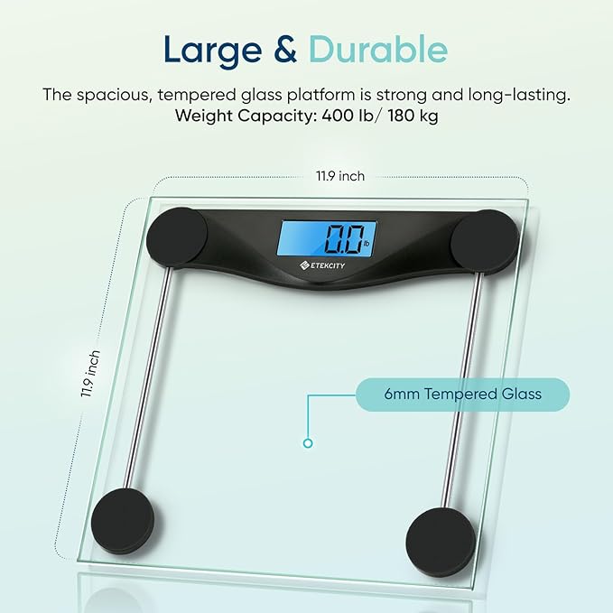 Etekcity Digital Body Weight Bathroom Scale, Large Blue LCD Backlight Display, High Precision Measurements, 6mm Tempered Glass, 400 Pounds, Black