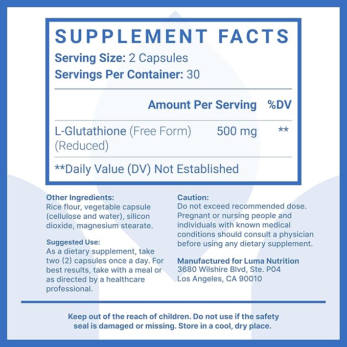 Luma Nutrition Premium Glutathione Supplement - 500mg - L-Glutathione - Antioxidant Support - Reduced - Liver Support - 60 Capsules