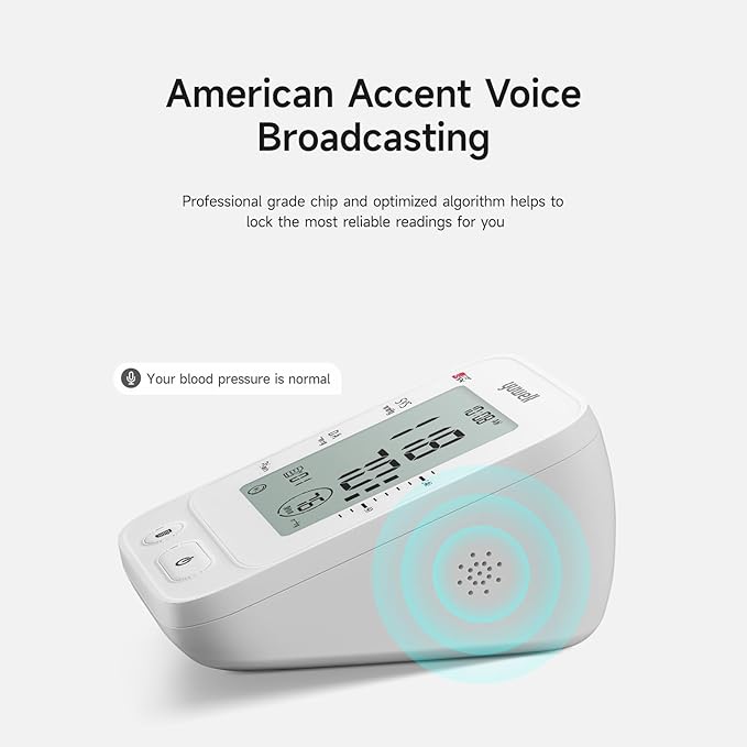 - 【Voice Broadcast】: yuwell blood pressure monitor features one button operation. After wrapping the upper arm cuff well, the ameciran accent voice broadcast will follow up the whole measurement, intelligent diagnosis will remind you if your blood pressure is normal or not at the end of measurement