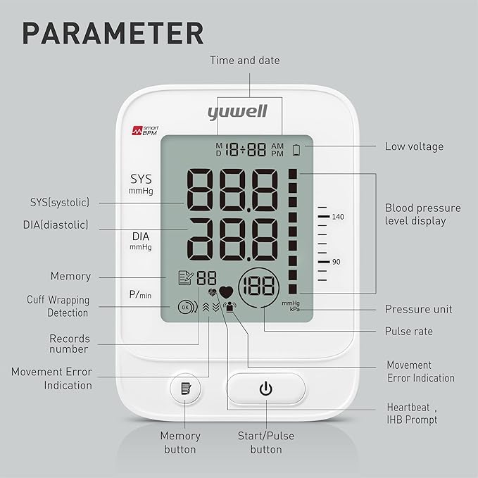 - 【Thoughtful Design】: yuwell blood pressure monitor large cuff can capture any body movement during the test and remind you correct testing posture. The design with hypertension indicator and irregular heartbeat alert for fitness tracker is perfect for home use. A host, an arm cuff, a power adapter, a manual, a storage bag and a packing box are included