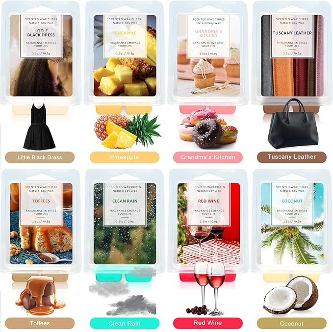- FLAVORS - A cozy, rich seasonal mix of 8 flavors scented soy wax melts, including Pineapple, Red Wine, Toffees, Tuscany Leather, Grandma’s Kitchen, Clean Rain, Little Black Dress, Coconut
