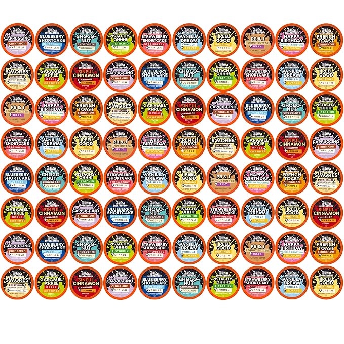 - Assorted flavored sampler with a wide variety of fun and indulgent flavors such as Blueberry Shortcake, Choco Nut, Pistachy Ohhh!, Strawberry Shortcake, Vanilla Dream, I Peel Good, PB & J, Happy Birthday, Cappuccino, S’mores, Caramel Apple, Sinful Cinnamon, and French Toast.