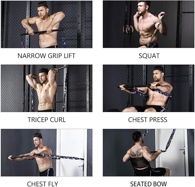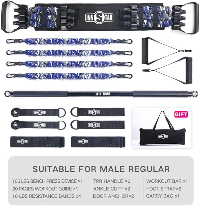 - ★SHAPE YOUR WHOLE BODY TONE YOUR MUSCLE: 9 different accessories could combine into different combos to tone and shape. Work your arm, legs and butt with resistance bands, achieve perfect chest training with bench press device, stimulate your core with squat resistance band and burn you leg muscle with foot straps!
