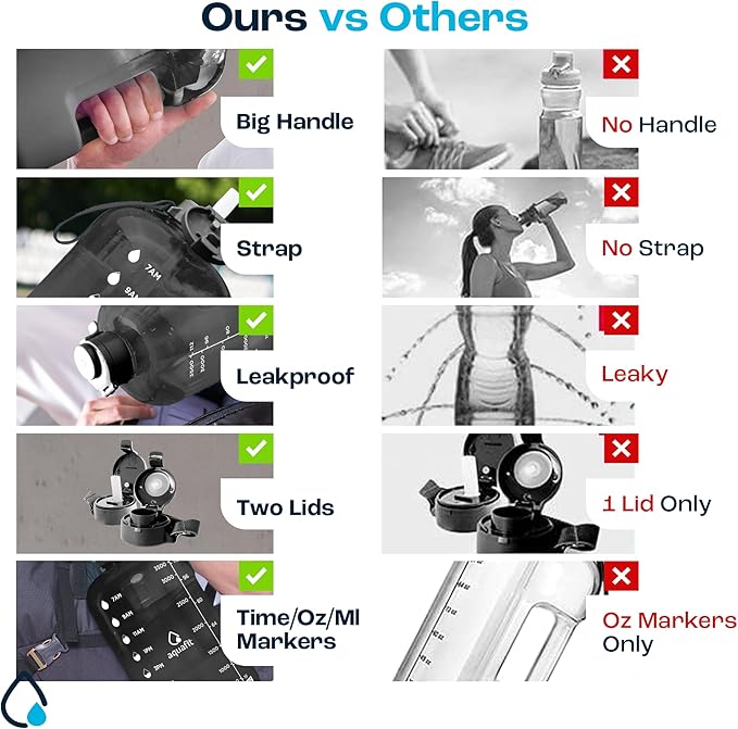 - Track how much you drink - Our BPA Free one gallon water bottle comes with time markers on the side so you can see your daily water intake and stay on track meet your health and fitness goals.