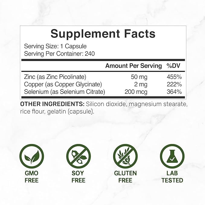 - Dosage & Servings – A powerful one a day formula that offers 240 potent capsules per bottle. Each serving will provide 50mg zinc picolinate, 200mcg selenium citrate, and 2mg copper glycinate.