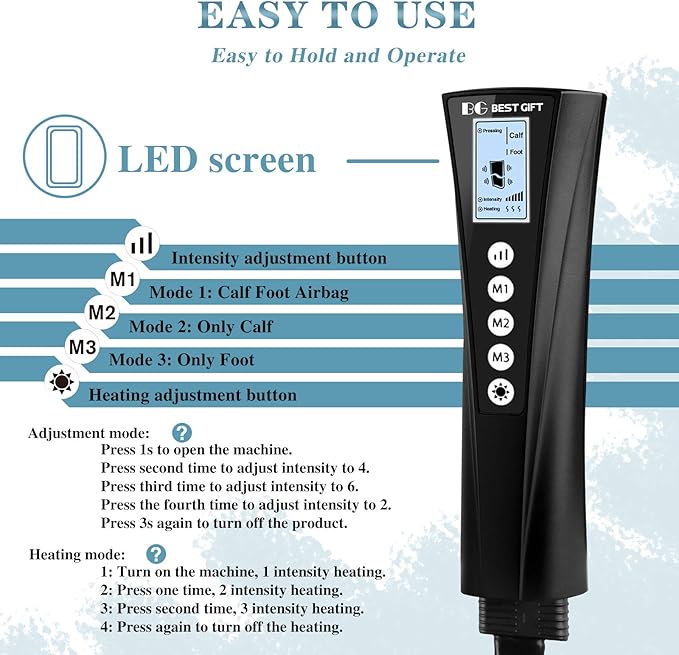 - 3 Modes and 3 Intensities: Air compression leg masssager easily and safe adjust different modes and intensities through the handheld remote control. 3 modes and 3 intensities aim at different parts, leg compression machine for home use providing you with accurate foot and calf massage for pain and circulation. The 20-minute timer shutdown function makes your use more convenient