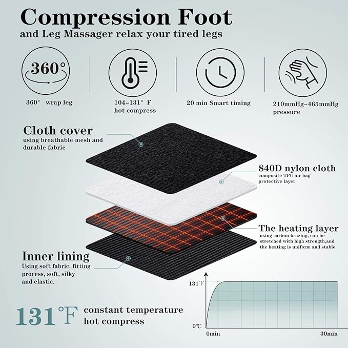 - 3 Gears Heating Function: leg massager for circulation provides heating function. Let you experience foot and leg spa with heat and massage. Turning on the machine is the first level of heat, press the heating button to increase the level, there are three levels of heat can be adjusted for low, medium and high. Use foot and calf massager to enjoy confortable leg and foot massage