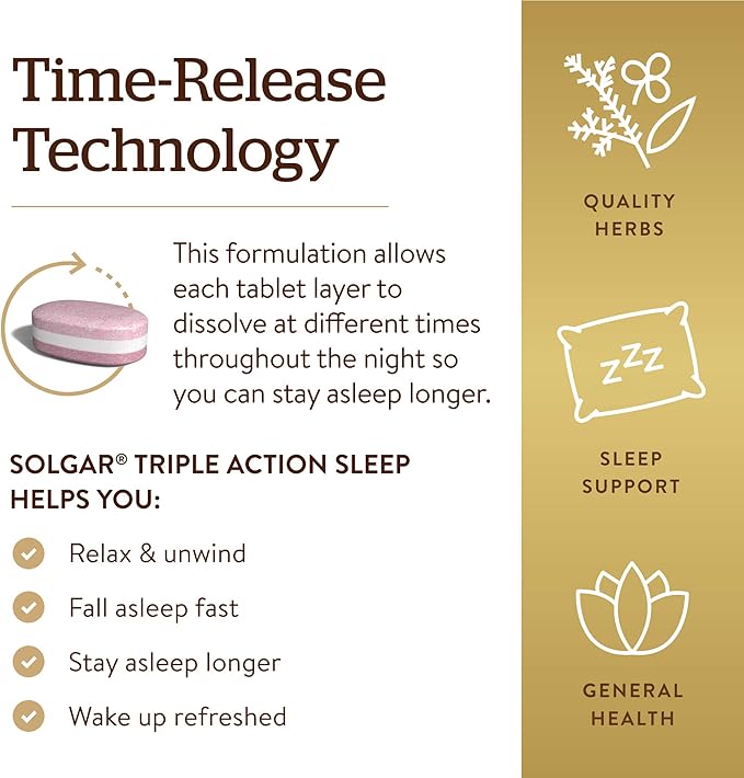 - Tri-Layer Technology; Solgar Triple Action Sleep leverages clinically studied time-release technology that allows each tablet layer to dissolve at different times throughout the night; It helps you relax & unwind, get better sleep & wake up refreshed