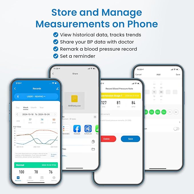 - Smart Connectivity: Keep track of your blood pressure readings with ease using the RENPHO wireless blood pressure monitor. Simply connect it to the Renpho Health app on your iOS or Android device, and you'll be able to store and view your historical measurement data and track your progress on a daily, weekly, monthly, or yearly basis.