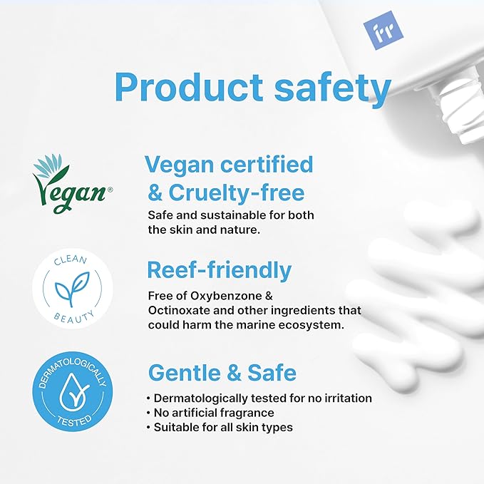 - [PRODUCT SAFETY] Reef-friendly. Vegan certified & Cruelty-free. Dermatologically tested for no irritation. No fragrance. Suitable for all skin types.