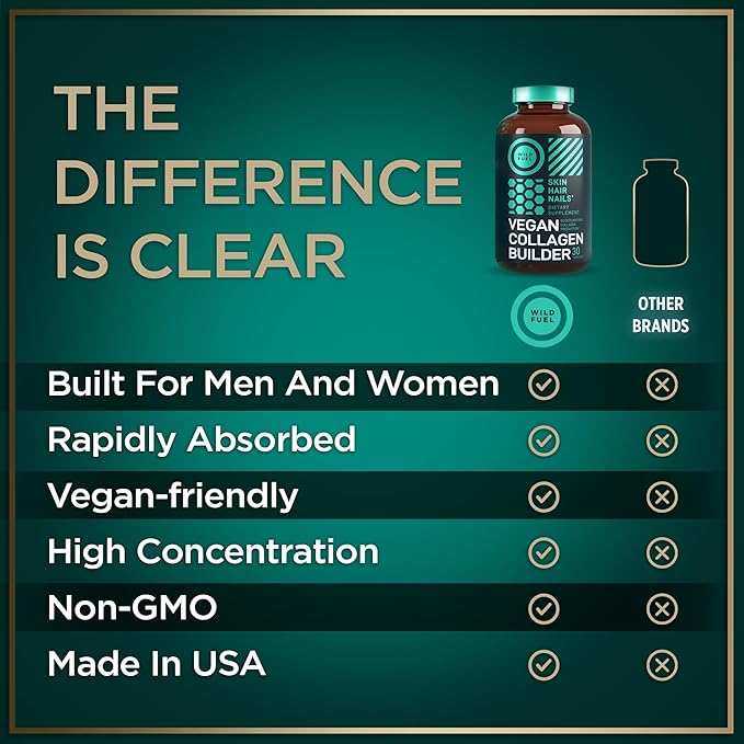 WILD FUEL Vegan Collagen Builder - Biotin, Organic Superfood, Amino Acids Glycine, Lysine, Proline Plant-Based Collagen Booster Supplements - 30 Organic Extract Tablets