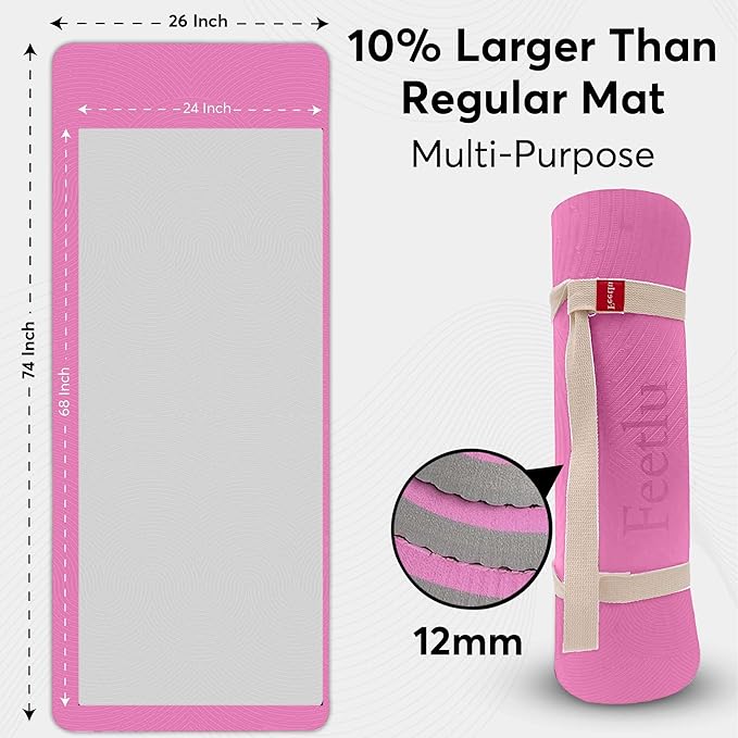 - [Large Size & Easy Transport] Generously sized at 74" x 26", it offers ample room to move freely. Weighing 4.4 lbs, it comes with a classic Feetlu yoga strap for easy carrying.