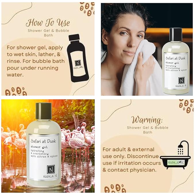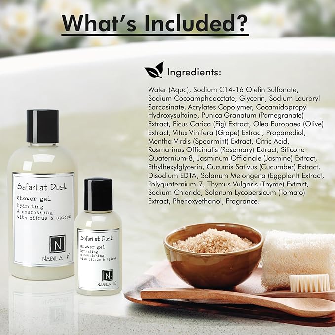 Nabila K Safari at Dusk Shower Gel Refreshing Body Wash with Citrus, Spice & Musk Fragrance, 8 oz - Naturally Derived, Sulfate-Free, Paraben-Free - Made in the USA