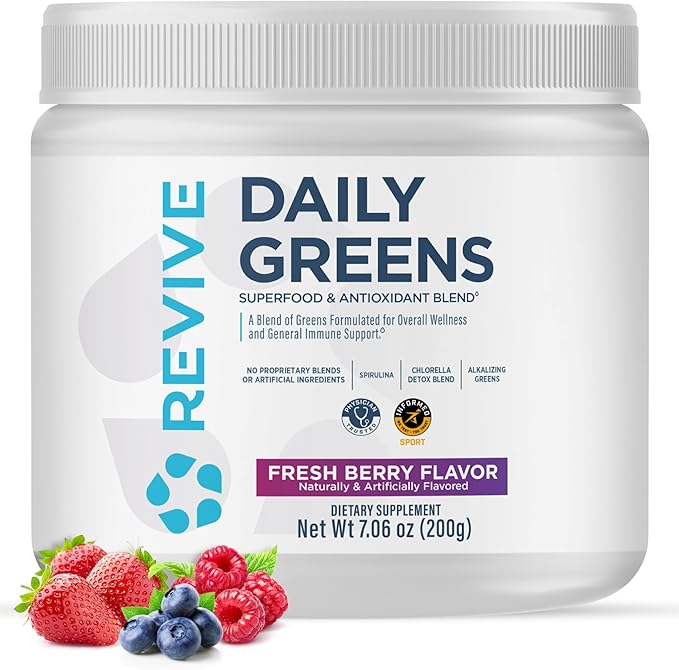 - Absorb Essential Nutrients: Daily Greens from Revive provides your body with a powerful dose of nutrient-dense greens and has been formulated for those with diets low in fruits and vegetables. If your daily intake of fruits and vegetables is lower than the recommended amount, this supplement is for you. Flavor: Fresh Berry. 10.47 oz, 30 servings.