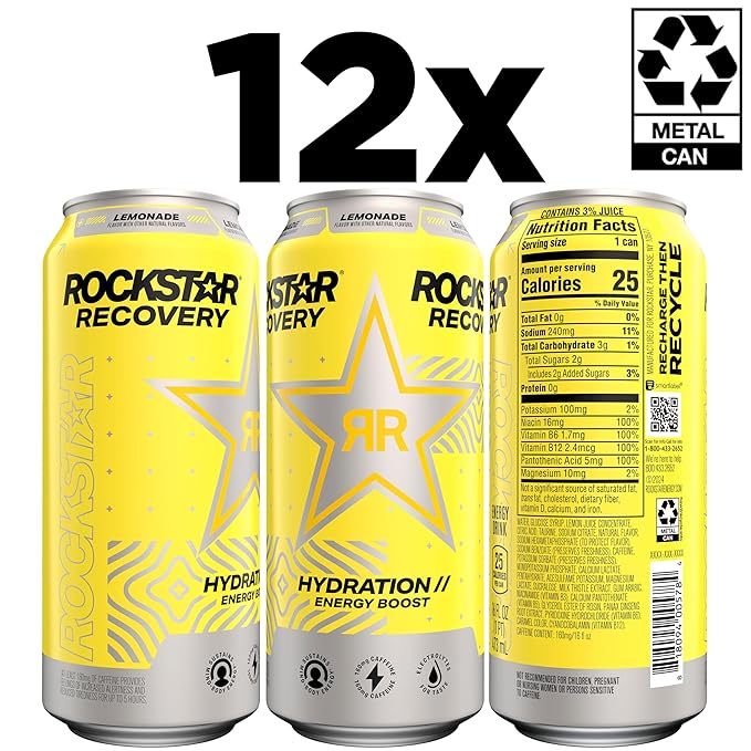 - Includes 12 (16oz) cans of Rockstar Recovery Energy Drink, Lemonade
